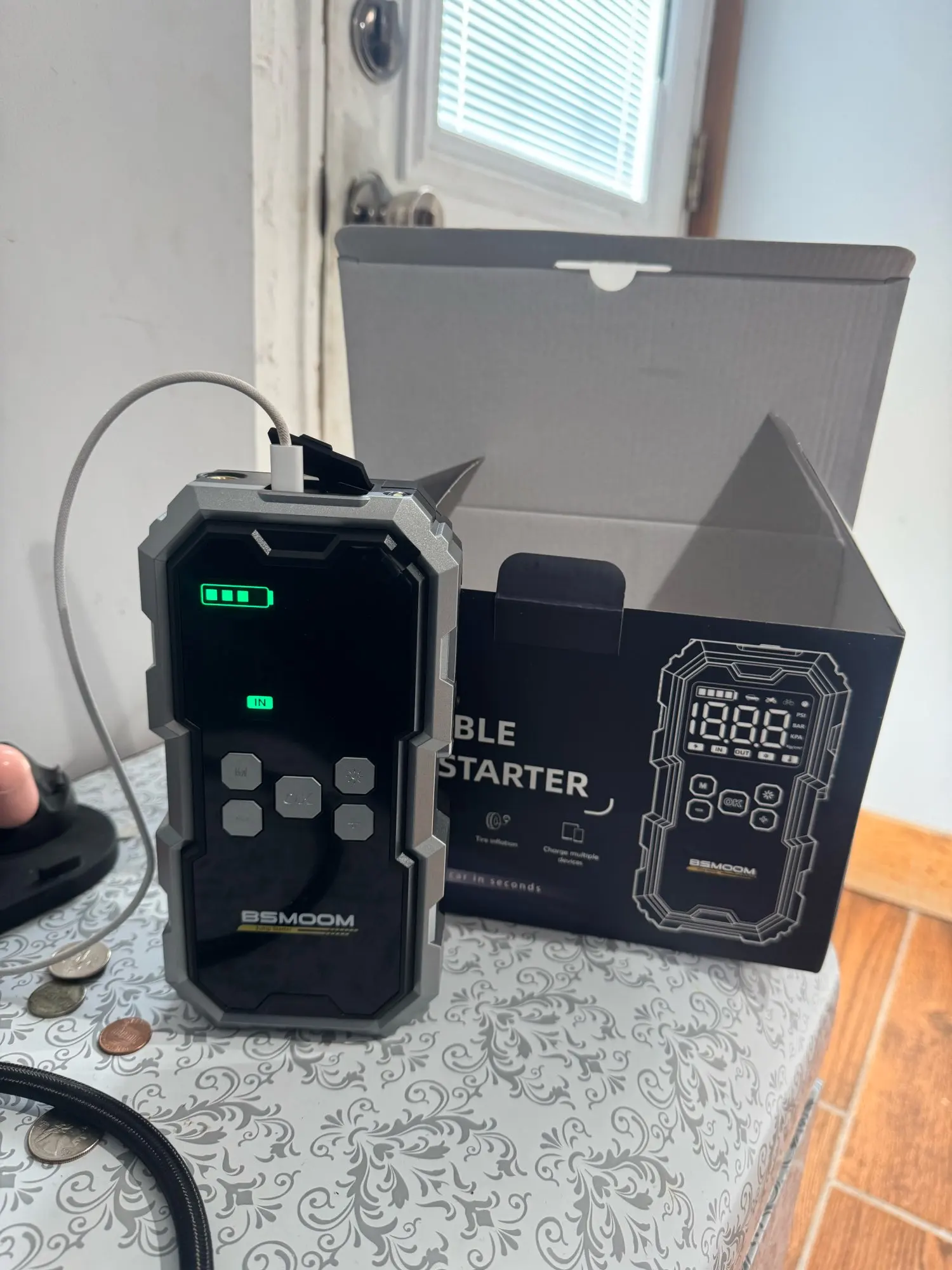 The device works very well. Test of all functions: booster / inflator / lighting. Very satisfied with the purchase ... Unfortunately, it was in the car that was stolen from us this weekend :(. I will need to order another one...