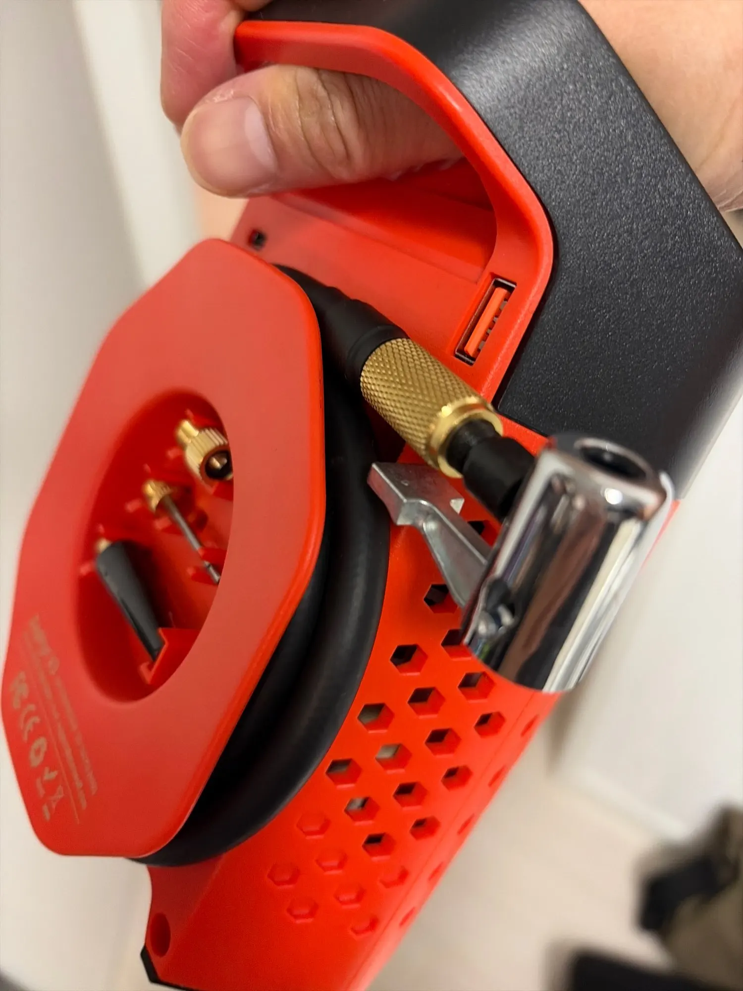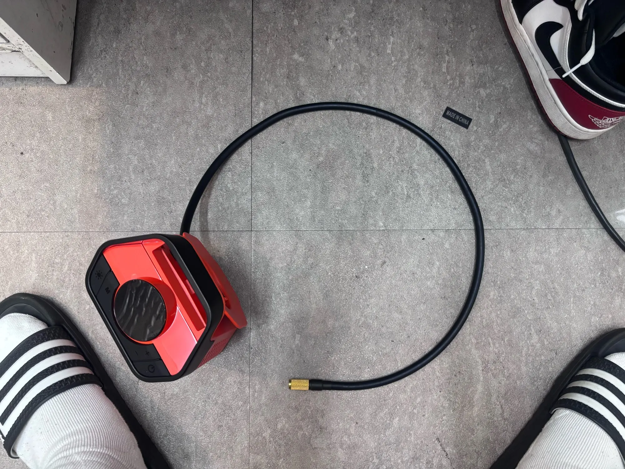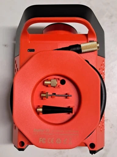 The size was more compact than expected, which was good. I added about +5PSI to the air pressure of 8 wheels on 2 vehicles, and it seems like there's about 1/3 of the battery left, so I'm satisfied with the margin. The speed is very fast, taking less than 10 minutes for one vehicle or about 1 minute per wheel. The air hose is long, and it's wrapped around the back of the main body, which is another reason for high satisfaction. The rest is similar to other brands' products.