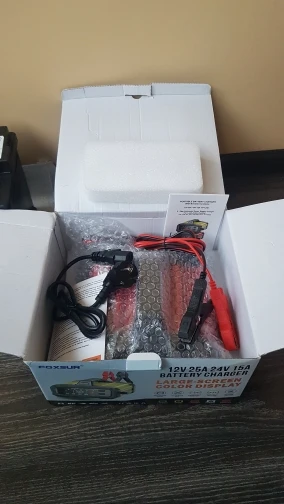 Delivery took about 2 weeks. Currently, I am charging a LiFePO4 100A battery from Redodo in automatic mode, it outputs no more than 15.5A. I also tried with acid batteries; the wires were warm, but when you set it to 25A, after 15-20 minutes they become very hot. In my opinion, the wires will need to be replaced. I was surprised that the machine does not deliver full power and charges LiFePO4 up to 14.2V, then shuts off, the voltage drops to 13.7V, and it turns on again for 3 minutes before shutting off. For a car battery, charging is great, but for LiFePO4 it's not so good, I'm a bit disappointed. I have a 2/2 light setting and in the evening I set it to 25A to charge quickly, and at night to Automatic 15.5A. I recommend the seller 100%. The package was packed perfectly but someone's curiosity slightly opened it. And crocodiles are excellent.